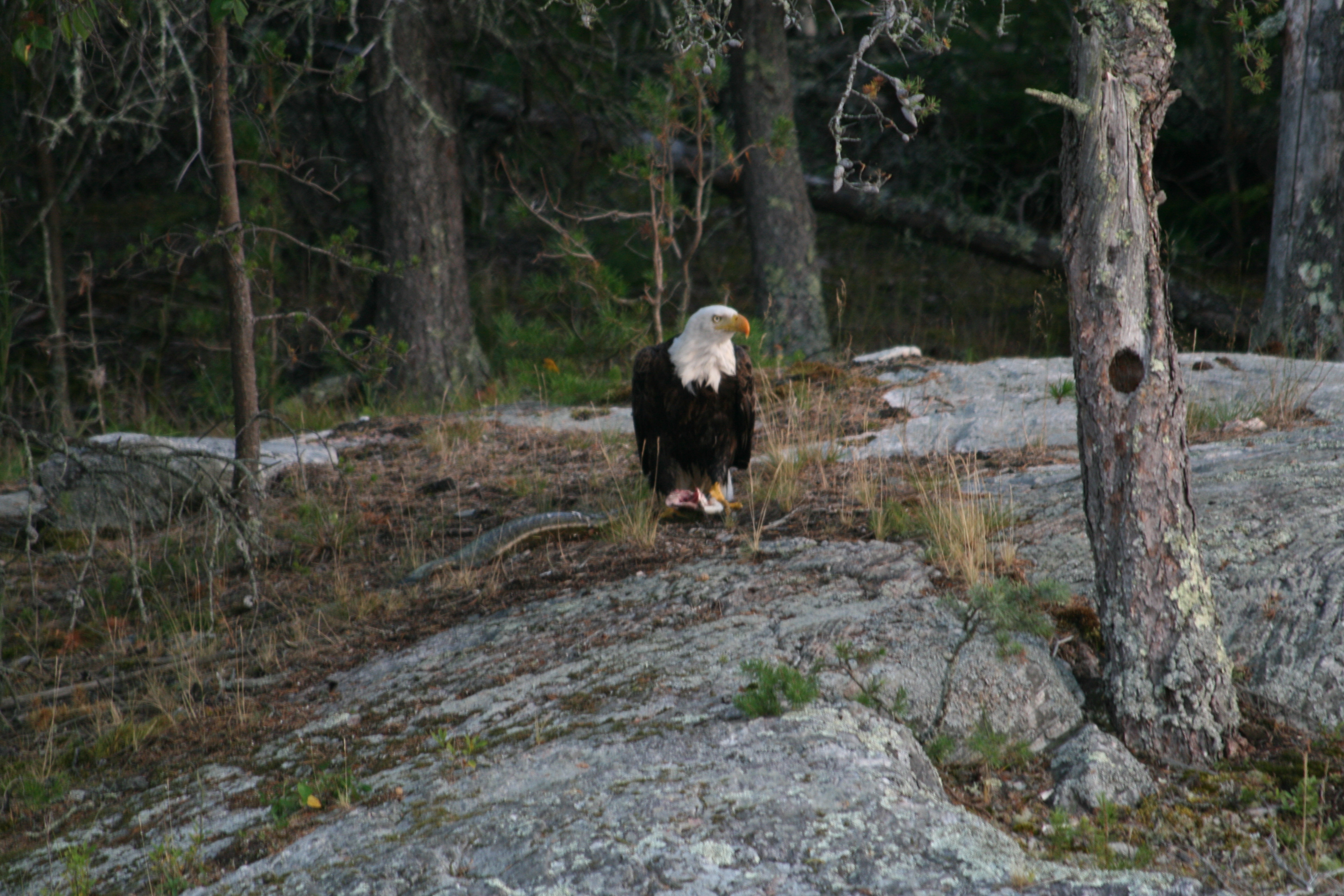 Saw the eagle dive into the water and then it couldn’t take off again and swam to shore. I went out in the boat to see if it made it and found it eating this massive pike. I guess it was too heavy to lift and there was no way it would let go. Determined bird.